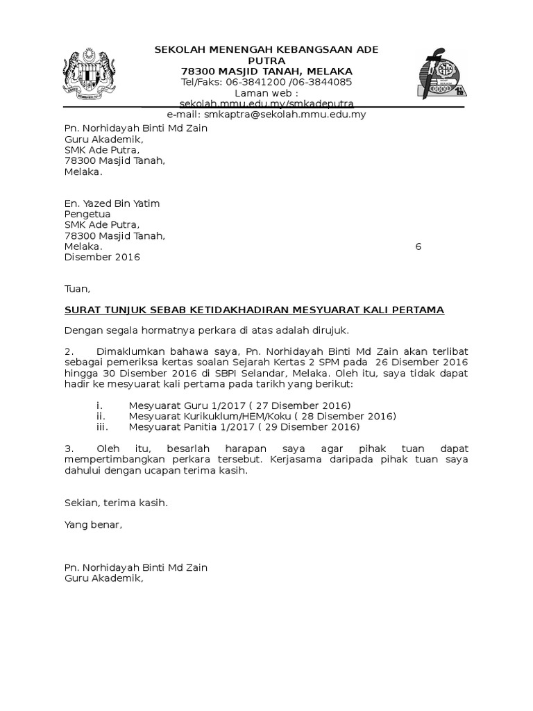 Surat Tunjuk Sebab Tidak Hadir Meyuarat Pdf